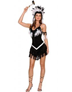 Stretch faux kjole med fjer og turkis perle trim snøre hals og frynse hæm. Indisk kostume omfatter kjole, hovedstykke og armbånd.